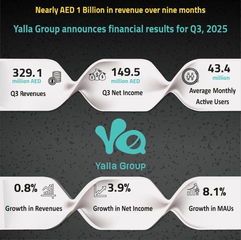 ووفقاً للبيانات المالية التي كشفت عنها مالكة أكبر منصة تواصل اجتماعي وألعاب في الشرق الأوسط وشمال افريقيا، فقد حققت يلا ارتفاعاً في الإيرادات بنسبة 0.8% لتصل إلى 329.1 مليون درهم، مقارنةً بالربع نفسه من العام الماضي، ما يعكس نمواً مطرداً في أعمال الشركة. وبذلك، يرتفع إجمالي إيرادات يلا في الأشهر التسعة الأولى من عام 2025 إلى 947.9 مليون درهم، بزيادة قدرها 3.7% مقارنة بـ 913.7 مليون درهم خلال الفترة نفسها من عام 2024.